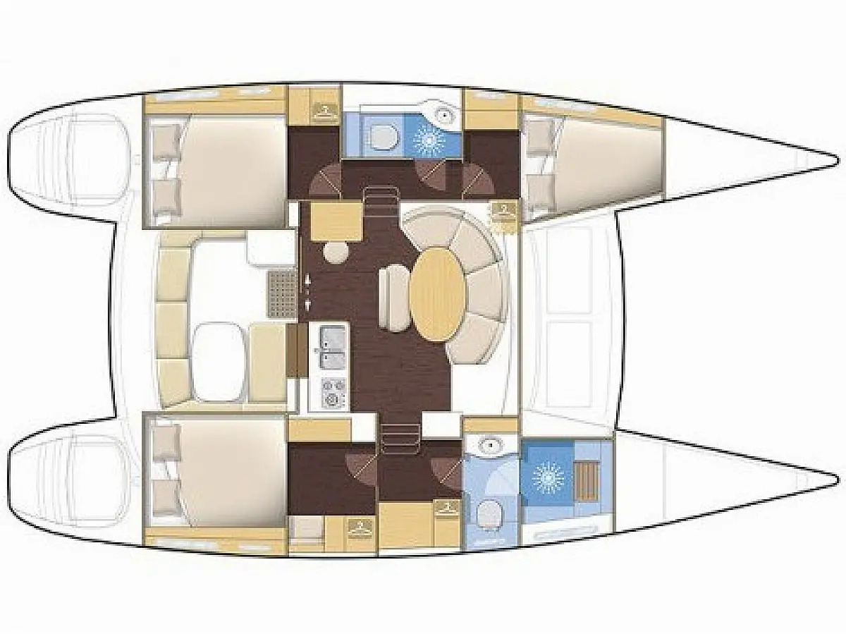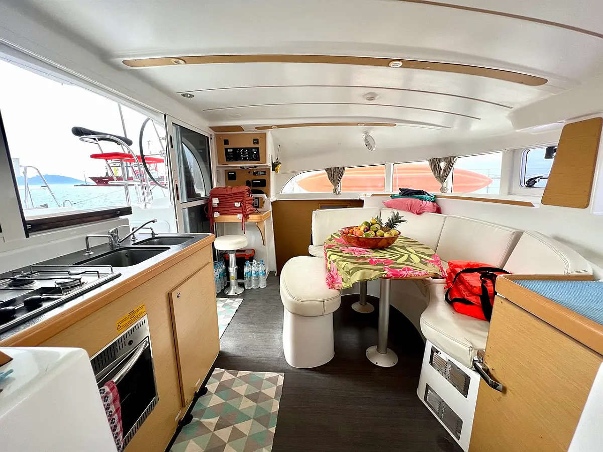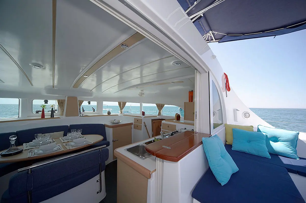 Barbecue dans le cockpit, Bimini, Coussins de cockpit, Dissalateur, Réfrigérateur, Moteur hors-bord, Panneaux solaires